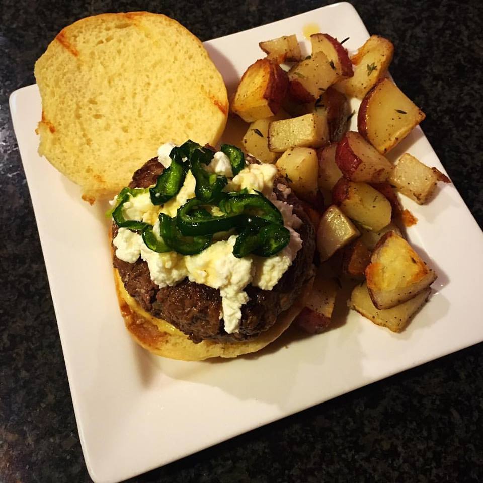 Serrano Pepper and Goat Cheese Burger with Roasted Rosemary Potatoes